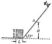 4、计算题 如图所示,滑板运动员从倾角为53°的斜坡顶端滑下,滑下的过程中他突然发现在斜面底端有一个高h=1.4m、宽L=1.2m的长方体障碍物,为了不触及这个障碍物,他必须在距水平地面高度H=3.2m的A点沿水平方向跳起离开斜面。已知运动员的滑板与斜面间的动摩擦因数μ=0.1,忽略空气阻力,重力加速度g取10m/s2。(已知sin53°=0.8,cos53°=0.6)求:
