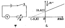 2、填空题 如图甲所示的电路可测出电压表的内阻,电源内阻可以忽略,R为电阻箱,当R取不同值时,电压表分别有一示数。若多次改变电阻箱的阻值,测得多个对应的电压值,最后作出的