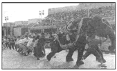 3、计算题 2009年3月5日,以色列一支篮球队的队员在耶路撒冷动物园和一头大象拔河,如图所示。设队员拉绳的力为2500N,大象始终保持静止,那么大象受到地面的摩擦力多大?