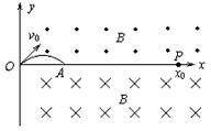 2、计算题 在实验室中,需要控制某些带电粒子在某区域内的滞留时间,以达到预想的实验效果。现设想在xOy的纸面内存在以下的匀强磁场区域,在O点到P点区域的x轴上方,磁感应强度为B,方向垂直纸面向外,在x轴下方,磁感应强度大小也为B,方向垂直纸面向里,OP两点距离为x0(如图所示)。现在原点O处以恒定速度v0不断地向第一象限内发射氘核粒子。