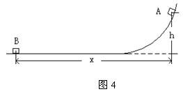5、填空题 如图(4)所示,一曲面和水平面平滑连接,将一物快从曲面上的A点由静止释放,物块滑至水平面B点停下,物块质量为m,测得A点的高度为h,AB两点水平线距为x,则物块在下滑过程中,摩擦力做功W= ;若曲面与水平面摩擦因数处处相同,则摩擦因数为 ;