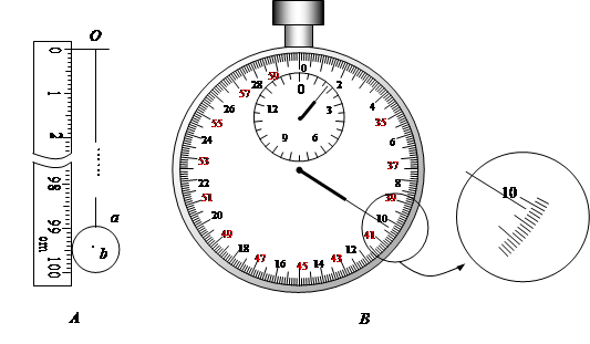 2、实验题 (1)在一次用单摆测定重力加速度的实验中,图(A)的O点是摆线的悬挂点,a、b点分别是球的上沿和球心,摆长L=_____________m.