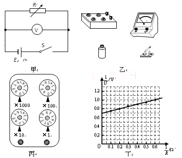 ③改变电阻箱的阻值,得到几组R、U值,作出图象如图丁,根据图象求得该电池的电动势E= ?,内阻r= ??(保留三位有效数字)