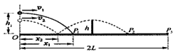 (1)若球在球台边缘O点正上方高度为h1处以速度v1水平发出,落在球台的P1点(如图实线所示),求P1点距O点的距离x;