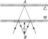 1、选择题 为了测河宽,在河的甲岸上,让两束激光同时射向乙岸上的A点,然后在甲岸边放一平面镜,如图14-1-8所示,两激光束经平面镜反射后相交于B点,B点至平面镜的距离为L.则所测河宽为___________.