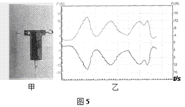 5、计算题 如图5(甲)所示为一拉力传感器,某实验小组在用拉力传感器探究作用力与反作用力关系的实验中,获得了如图5(乙)所示的图线,实验中要用到______个拉力传感器。根据这个图线,你可以得出的结论是:________?__。如果实验时保持一只手不动,另一只手拉动,与两只手同时对拉得到的结论有没有变化??(填“有”或“没有”);两只手边拉边向右运动,与两只手静止时对拉得到的结论有没有变化??(填“有”或“没有”)
