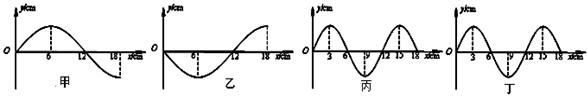 1、选择题  (6分) A、B两列简谐横波均沿x轴正向传播,某时刻的他们的波形分别如图甲、丙所示,经过时间t(t小于A波的周期TA),这两列简谐横波的波形分别变为图乙、丁所示,则A、B两列波的波速vA、vB之比可能的是(?)
