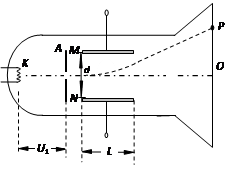 1、计算题 下图为一真空示波管的示意图,电子从灯丝K发出(初速度可忽略不计),经灯丝与A板间的电压U1加速,从A板中心孔沿中心线KO射出,然后进入两块平行金属板M、N形成的偏转电场中(偏转电场可视为匀强电场),电子进入M、N间电场时的速度与电场方向垂直,电子经过电场后打在荧光屏上的P点。 已知M、N两板间的电压为U2,两板间的距离为d,板长为L,电子的质量为m,电荷量为e,不计电子受到的重力及它们之间的相互作用力。