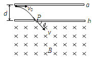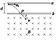 3、计算题 (12分)如图所示,水平放置的两块长直平行金属板a、b相距为d,b板下方整个空间存在着磁感应强度大小为B、方向垂直纸面向里的匀强磁场.今有一质量为m、电荷量为+q的带电粒子(不计重力),从a板左端贴近a板处以大小为v0的初速度水平射入板间,在匀强电场作用下,刚好从b板的狭缝P处穿出,穿出时的速度方向与b板所成的夹角为θ=30°,之后进入匀强磁场做圆周运动,最后粒子碰到b板的Q点(图中未画出)。求:
