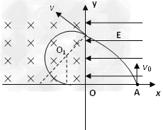 3、计算题  如图所示,坐标平面第Ⅰ象限内存在大小为E=4×105N/C方向水平向左的匀强电场,在第Ⅱ象限内存在方向垂直纸面向里的匀强磁场。质荷比为 N/C的带正电粒子从x轴上的A点以初速度v0=2×107m/s垂直x轴射入电场,OA=0.2m,不计重力。求:
