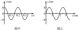 5、选择题  一列简谐横波沿x轴传播,图甲是x=0处质点的振动图象,图乙是该波t=0.15s时的波形图.则(  )