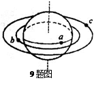 3、选择题  如图所示,a为放在赤道上的物体;b为沿地球表面附近做匀速圆周运动的人造卫星;c为地球同步卫星。以下关于a、b、c的说法中正确的是:(?)