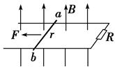 1、选择题 (2009年高考福建理综卷改编)如图9-3-14所示,固定放置在同一水平面内的两根平行长直金属导轨的间距为d,其右端接有阻值为R的电阻,整个装置处在竖直向上磁感应强度大小为B的匀强磁场中.一质量为m(质量分布均匀)的导体杆ab垂直于导轨放置,且与两导轨保持良好接触,杆与导轨之间的动摩擦因数为μ.现杆在水平向左、垂直于杆的恒力F作用下从静止开始沿导轨运动距离l时,速度恰好达到最大(运动过程中杆始终与导轨保持垂直).设杆接入电路的电阻为r,导轨电阻不计,重力加速度大小为g.则此过程( )