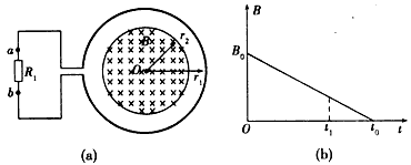 1、计算题  如图(a)所示,一个电阻值为R,匝数为n的圆形金属线圈与阻值为2R的电阻R1连接成闭合回路,线圈的半径为r1,在线圈中半径为r2的圆形区域内存在垂直于线圈平面向里的匀强磁场,磁感应强度B随时间t变化的关系图线如图(b) 所示图线与横、纵轴的截距分别为t0和B0导线的电阻不计,求0至t1时间内