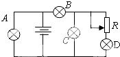 4、选择题  如图所示的电路中,A、B、C、D是四只相同的灯泡.当滑动变阻器的滑动片向下滑动时,下列说法正确的是(  )
