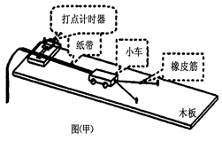 1、实验题 “探究功与速度变化的关系”的实验装置如图(甲)所示.当小车在一条橡皮筋作用下弹出时,橡皮筋对小车做的功记为.当用2条、3条完全相同的橡皮筋并在一起进行第2次、第3次实验时,橡皮筋对小车做的功记为2W,3W。