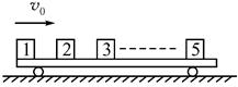 1、简答题 如图所示的光滑水平面上,质量为M的平板车上依次放有5个质量均为m的小滑块(不计其大小),质量关系为M=5 m,已知平板车长L=1 m,小滑块与平板车间的动摩擦因数μ=9/20,g=10 m/s2。现突然给最左端的小滑块沿平板向右的速度v0,当其相对地的速率降至v0/2时恰好与前方的第2个滑块相碰。碰撞时间极短,碰撞后两滑块的速度变为对方碰撞前的速度(也叫速度交换)。以后将陆续发生小滑块相碰,碰撞时间都很短,碰后均交换速度。最后第5个滑块恰好滑至平板车右端而与平板车相对静止。