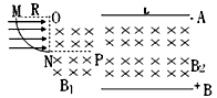 4、计算题 如图所示,MN是一段在竖直平面内半径为1m的光滑的1/4圆弧轨道,轨道上存在水平向右的匀强电场。轨道的右侧有一垂直纸面向内的匀强磁场,磁感应强度为B1=0.1T。现有一带电量为+1C质量为100g的带电小球从M点由静止开始自由下滑,恰能沿NP方向做直线运动,并进入右侧的复合场。(NP沿复合场的中心线) 已知AB板间的电压为UBA=2V,板间距离d=2m,板的长度L=3m,若小球恰能从板的边沿飞出,NP沿复合场的中心线,g取10m/s2。试求: