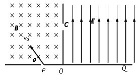 1、计算题 如图所示的区域中,左边为垂直纸面向里的匀强磁场,磁感应强度为B,右边是一个电场强度大小未知的匀强电场,其方向平行于OC且垂直于磁场方向。一个质量为m、电荷量为-q的带电粒子从P孔以初速度V0沿垂直于磁场方向进入匀强磁场中,初速度方向与边界线的夹角θ=60°,粒子恰好从C孔垂直于OC射入匀强电场,最后打在Q点,已知OQ=2OC,不计粒子的重力,求: