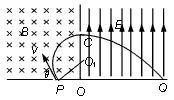 1、计算题  如图所示的区域中,左边为垂直纸面向里的匀强磁场,磁感应强度为B,右边是一个电场强度大小未知的匀强电场,其方向平行于OC且垂直于磁场方向。一个质量为m、电荷量为-q的带电粒子从P孔以初速度V0沿垂直于磁场方向进入匀强磁场中,初速度方向与边界线的夹角θ=60°,粒子恰好从C孔垂直于OC射入匀强电场,最后打在Q点,已知OQ=2OC,不计粒子的重力,求:
