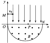 3、计算题 如图,在平面直角坐标系xOy内,第1象限存在沿y轴负方向的匀强电场,第IV象限以ON为直径的半圆形区域内,存在垂直于坐标平面向外的匀强磁场,磁感应强度为B。一质量为m、电荷量为q的带正电的粒子,从y轴正半轴上y=h处的M点,以速度v0垂直于y轴射入电场,经x轴上x=2h处的P点进入磁场,最后以垂直于y轴的方向射出磁场。不计粒子重力。求: