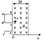 3、选择题 某同学用粗细均匀的同一种导线制成“9”字形线框,放在有理想边界的匀强磁场旁,磁感应强度为B,如图所示,已知磁场的宽度为2d,ab=bc=cd=da=ce=ef=d,导线框从紧靠磁场的左边界以速度v向x轴的正方向匀速运动,设U0=Bdv。在下图中最能体现be两点间的电压随坐标x变化关系的图象是