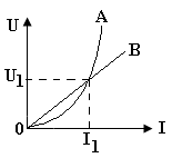 本题解析:根据U-I线及欧姆定律可知,电阻A的电阻随电流的增大而增大,电阻B阻值不变,选项A正确,B错误;在两图线交点处,电阻两端的电压和电流均相等,故电阻A的阻值等于电阻B,选项CD错误,故选A。