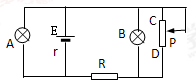 1、选择题 如图所示,A、B为相同的两个灯泡,均发光,当变阻器的滑片P向下端滑动时,则( )