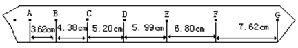 2、实验题  某同学在“用打点计时器测速度”的实验中,用打点计时器记录了被小车拖动的纸带的运动情况,在纸带上确定出A、B、C、D、E、F、G共7个计数点。其相邻点间的距离如图所示,每两个相邻的测量点之间的时间间隔为0.10s。(计算结果保留3位有效数字)