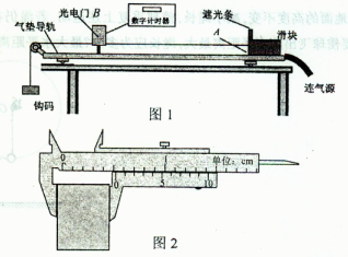 3、实验题  某实验小组利用图1的装置验证钩码和滑块组成的系统机械能守恒,在水平桌面上固定一气垫导轨,导轨上A点处有一带长方形遮光条的滑块,其总质量为M,左端由跨过轻质光滑定滑轮的细绳与一质量为m的钩码相连,且M:m =3:1,遮光条两条长边与导轨垂直,导轨上B点处有一光电门,可以测量遮光条经过光电门时的挡光时间△t,用d表示遮光条的宽度,s表示A、B两点的距离,g表示当地的重力加速度.(计算结果保留两位有效数字)