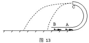 3、计算题 如图13所示,半径为R、内径很小的光滑半圆轨道竖直放置在水平地面上,两个质量为m的小球A、B(直径略小于管内径),以不同速度进入管内。A通过轨道的最高点C时,对管壁恰好无弹力的作用。A、B两球落地点的水平距离为4R,求:B球在最高点C对管壁的弹力大小和方向。(两球离开管后在同一竖直面内运动)