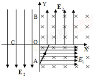 3、计算题 (13分)直角坐标系中,第四象限有与X轴正方向相同的匀强电场;另一匀强电场在第一象限,其方向与Y轴正方向相同,在第二和第三象限其电场方向与Y轴负方向相同。同时在X轴的正半轴有垂直纸面向里的匀强磁场。如图所示,现一质量m、电量q的电荷从A点以速度v,与Y轴正向成30°夹角进入该直角坐标系中。先做直线运动,接着在第一象限恰好做匀速圆周运动,且与X轴垂直相交于B点,后在第二象限发生偏转与X轴负半轴交于C点。已知重力加速度为g。求: