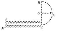 3、计算题 (8分)如图,光滑半圆弧轨道半径为r来源:91考试网 91exam.org,OA为水平半径,BC为竖直直径。水平轨道CM与C点相切,轨道上有一轻弹簧,一端固定在竖直墙上,另一端恰位于轨道的末端C点(此时弹簧处于自然状态)。一质量为m的小物块自A处以竖直向下的初速度v0=滑下,到C点后压缩弹簧进入水平轨道,被弹簧反弹后恰能通过B点。重力加速度为g,求: