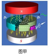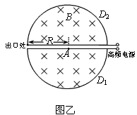 1、计算题 1932年美国物理学家劳伦斯发明了回旋加速器,巧妙地利用带电粒子在磁场中的运动特点,解决了粒子的加速问题。现在回旋加速器被广泛应用于科学研究和医学设备中。某型号的回旋加速器的工作原理如图甲所示,图为俯视图乙。回旋加速器的核心部分为D形盒,D形盒装在真空容器中,整个装置放在巨大的电磁铁两极之间的强大磁场中,磁场可以认为是匀强在场,且与D形盒盒面垂直。两盒间狭缝很小,带电粒子穿过的时间可以忽略不计。D形盒半径为R,磁场的磁感应强度为B。设质子从粒子源A处时入加速电场的初速度不计。质子质量为m、电荷量为+q。加速器接一定涉率高频交流电源,其电压为U。加速过程中不考虑相对论效应和重力作用。