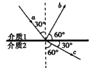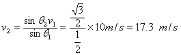 5、计算题 如图所示,a、b、c分别为入射波、反射波、折射波,已知入射波波速v=10 m/s,入射角θ1为30°,反射波线与折射波线相垂直,求折射波的速度。