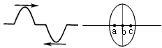 1、填空题 如图所示,两列振幅和波长都相同而传播方向相反的机械横波,在相遇的某一时刻“突然”消失。设在这一时刻两波相遇的介质里有a、b、c三个介质质点,其中b点是相遇区域的中点。可以判断,质点____________的振动速度为零;质点____________的振动速度不为零且方向向下。