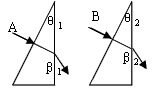 1、选择题 如图,是两个同种玻璃制成的棱镜,顶角θ1略大于θ2,两束单色光A和B分别垂直入射于三棱镜后,出射光线与第二界面的夹角β1=β2,则下列判断正确的