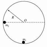 1、计算题 如图所示,内壁光滑半径为R的圆形轨道,固定在竖直平面内.质量为m1的小球静止在轨道最低点,另一质量为m2的小球(两小球均可视为质点)从内壁上与圆心O等高的位置由静止释放,运动到最低点时与m1发生碰撞并粘在一起.求