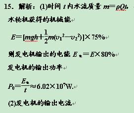 3、计算题 (14分)为了减少因火电站中煤的燃烧对大气的污染,目前正大力发展水电站.某一水电站发电机组设计为:水以v1=3 m/s的速度流入水轮机后以v2=1 m/s的速度流出,流出水位比流入的水位低100 m,水流量为Q=100 m3/s,水轮机效率为75%,发电机效率为80%,求:(g=10 m/s2,水的密度ρ=103 kg/m3)