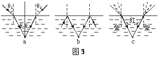 (3)光线从空气中折射入水中时,要发生色散现象:红光的折射率最小,偏向角最小;紫光的折射率最大,偏向角最大.因为眼睛感觉光线是沿直线传播的,所以从水中看到的彩色“洞”边,是内紫外红(如图3所示图c)。