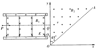 5、计算题 如图所示的平行板器件中,存在相互垂直的匀强磁场和匀强电场,磁场的磁感应强度B1=0.40T,方向垂直纸面向里,电场强度E=2.0×105V/m,PQ为板间中线。紧靠平行板右侧边缘xOy坐标系的第一象限内,有垂直纸面向外的匀强磁场,磁感应强度B2=0.25T,磁场边界AO和y轴的夹角角AOy=45°,一束带电量q=8.0×10-19C的正离子从P点射入平行板间,沿中线PQ做直线运动,穿出平行板后从y轴上坐标为(0,0.2m)的Q点垂直y轴射入磁场区,离子通过x轴时的速度方向与x轴正方向夹角在45°-90°之间,则: