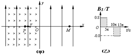 3、计算题 (15分)如图(甲)所示,在xoy平面内有足够大的匀强电场,电场方向竖直向上,电场强度E=40N/C。在y轴左侧平面内有足够大的瞬时磁场,磁感应强度B1随时间t变化规律如图(乙)所示,15πs后磁场消失,选定磁场垂直向里为正方向。在y轴右侧平面内还有方向垂直纸面向外的恒定的匀强磁场,分布在一个半径为r=0.3m的圆形区域(图中未画出),且圆的左侧与y轴相切,磁感应强度B2=0.8T。t=0时刻,一质量m=8×10-4kg、电荷量q=+2×10-4C的微粒从x轴上xP=-0.8m处的P点以速度v=0.12m/s向x轴正方向入射,重力加速度g取10m/s2。