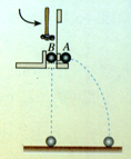 2、选择题 如图,用小铁锤打击弹性金属片后,A球沿水平方向飞出,同时B球被松开,自由下落。A、B两球同时开始运动。则(?)
