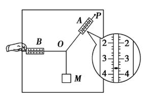 5、实验题 (4分).某同学用如图所示的实验装置来验证“力的平行四边形定则”。弹簧测力计A挂于固定点P,下端用细线挂一重物M。弹簧测力计B的一端用细线系于O点,手持另一端向左拉,使结点O静止在某位置。分别读出弹簧测力计A和B的示数,并在贴于竖直木板的白纸上记录O点的位置和拉线的方向。