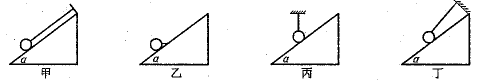3、选择题 如图所示,光滑斜面的倾角都是a,球的质量都是m,球都用轻绳系住静止在斜面上,甲的悬线与斜面平行,乙的悬线沿水平方向,丙的悬线沿竖直方向,丁的悬线与水平面的夹角大于a。关于球对斜面压力的大小FN有下列说法:①甲图FN一定最大;②乙图FN一定最大;③丙图FN一定为零;④丁图FN可能最小。以上说法正确的有?(?)