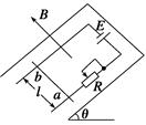 3、计算题 如图所示,在倾角θ=30°的斜面上,固定一金属框,宽l=0.25 m,接入电动势E=12 V、内阻不计的电池.垂直框面放置一根质量m=0.2 kg的金属棒ab,它与框架间的动摩擦因数μ=
