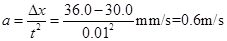 (19.87-10.26)-10.26=-0.65cm;(28.82-19.87)-(19.87-10.26)=0.66cm,因此该物体应该是匀减速直线运动,加速度利用逐差法求出为,即a=2.16 m/s2