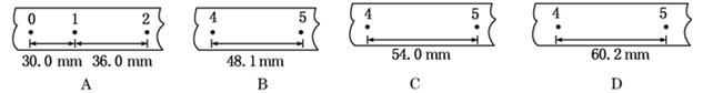 2、实验题 某同学在测定匀变速直线运动的加速度时,得到了几条较为理想的纸带,已在每条纸带上每5个计时点取好了一个计数点,依打点先后编为0、1、2、3、4、5.由于不小心,纸带被撕断了,如图所示.请根据给出的A、B、C、D四段纸带回答:?
