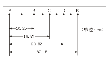 1、填空题 小车拖着穿过打点计时器的纸带做匀变速运动,如图是经打点计时器打出纸带的一部分,打点的先后顺序是A、B、C、D、E,已知交流电频率为50Hz,纸带上每相邻两个计数点间还有一个点。根据上述叙述,判断小车是做?运动(填“匀速”、“匀加速”或“匀减速”),D点的速度是?m/s。(结果保留3位有效数字)