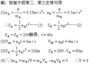 两只船A、B在水面上相距200m,用绳连接起来处于静止状态,假设A船上的人以300N的恒力开始拉绳子,若A、B的质量分别为2000kg和3000kg,人与绳子的质量及水的阻力均忽略不计,则: